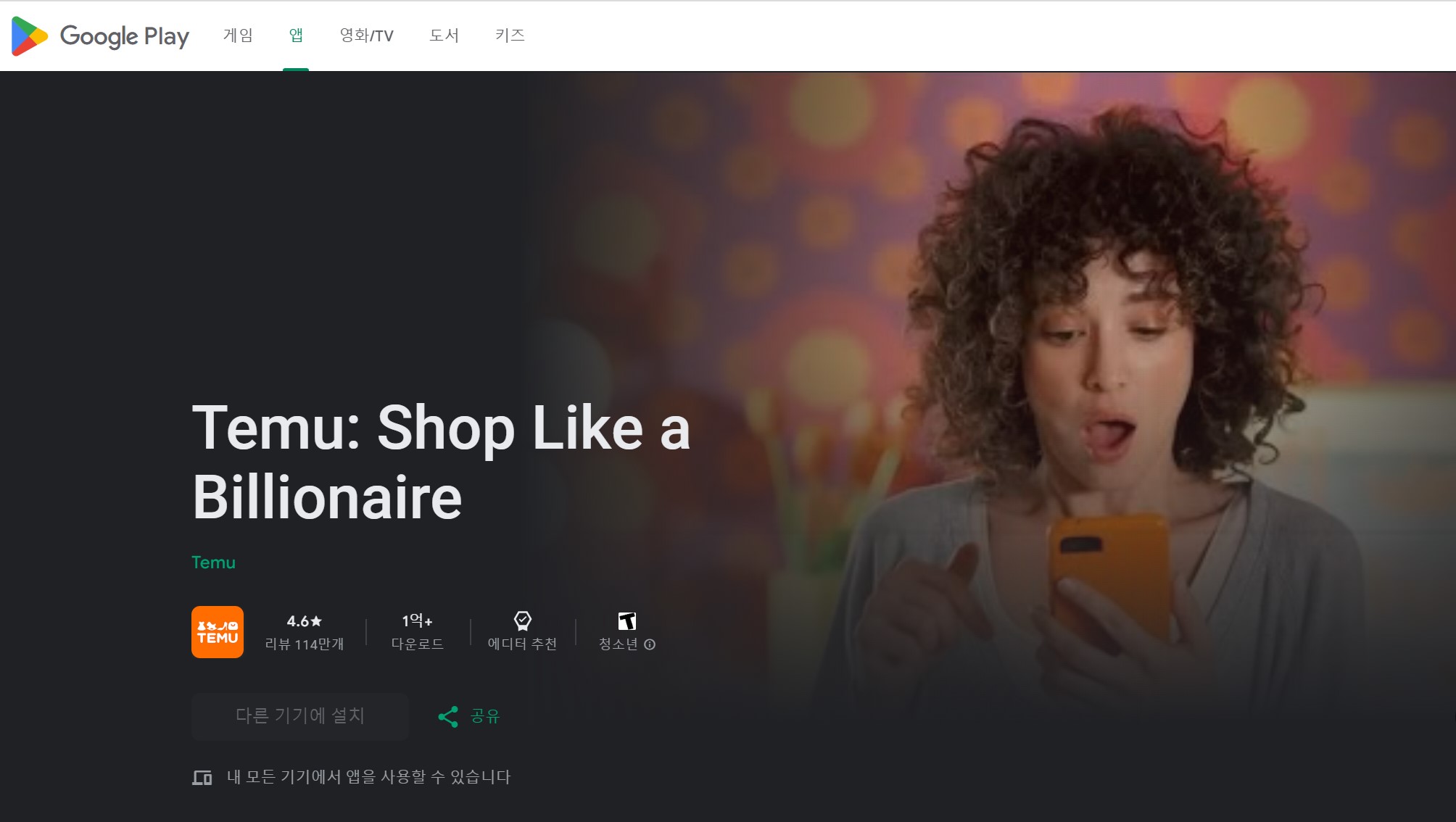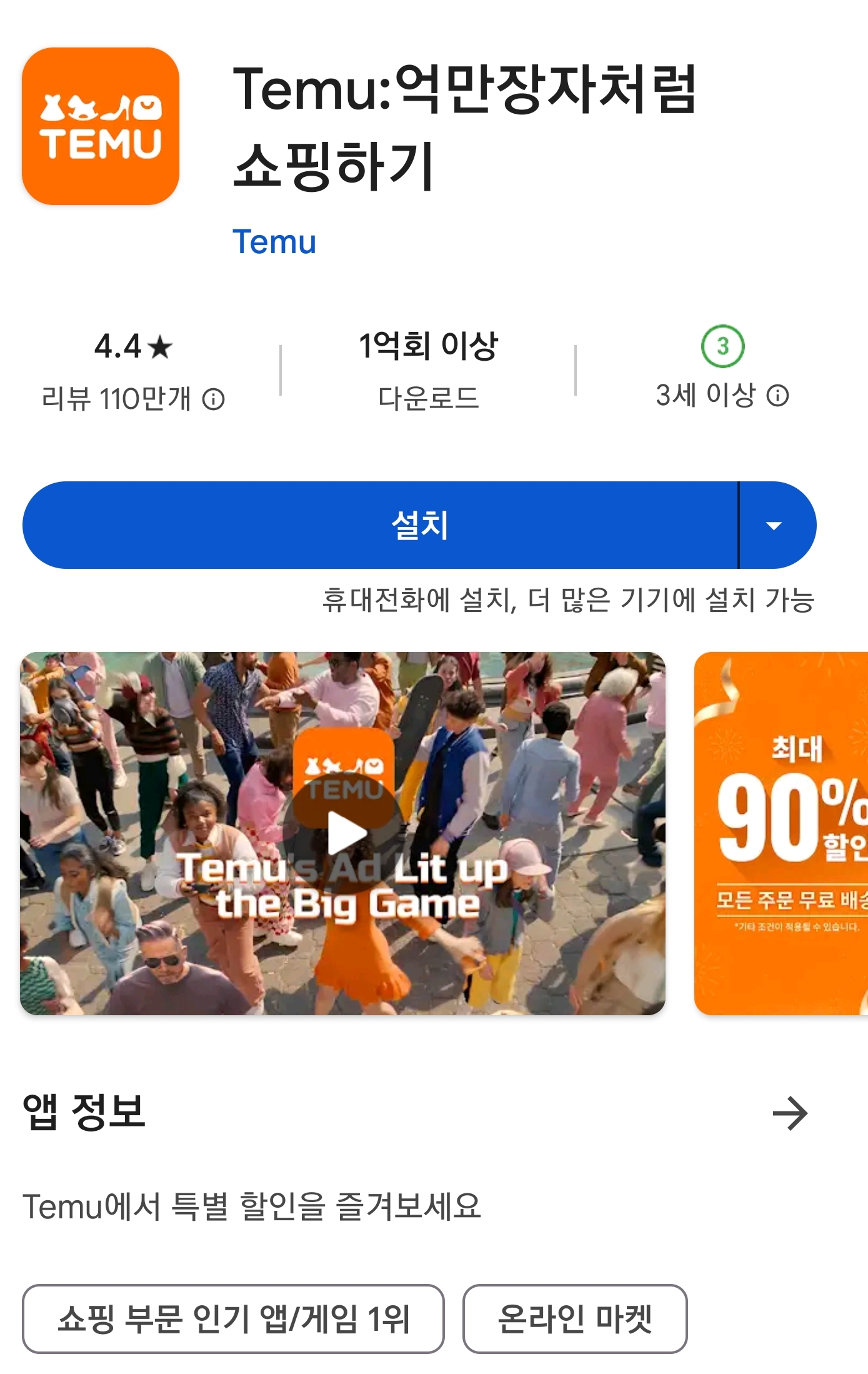 모바일로 더 손쉽게 테무를 이용하실분들은 아래 Playstore에 접속하셔서 Temu (테무) 검색하시면 바로 첫번째순위로 검색됩니다. 아래 어플 다운로드하시면 됩니다 (벌써 1억회 이상 다운로드 완료되었네요)