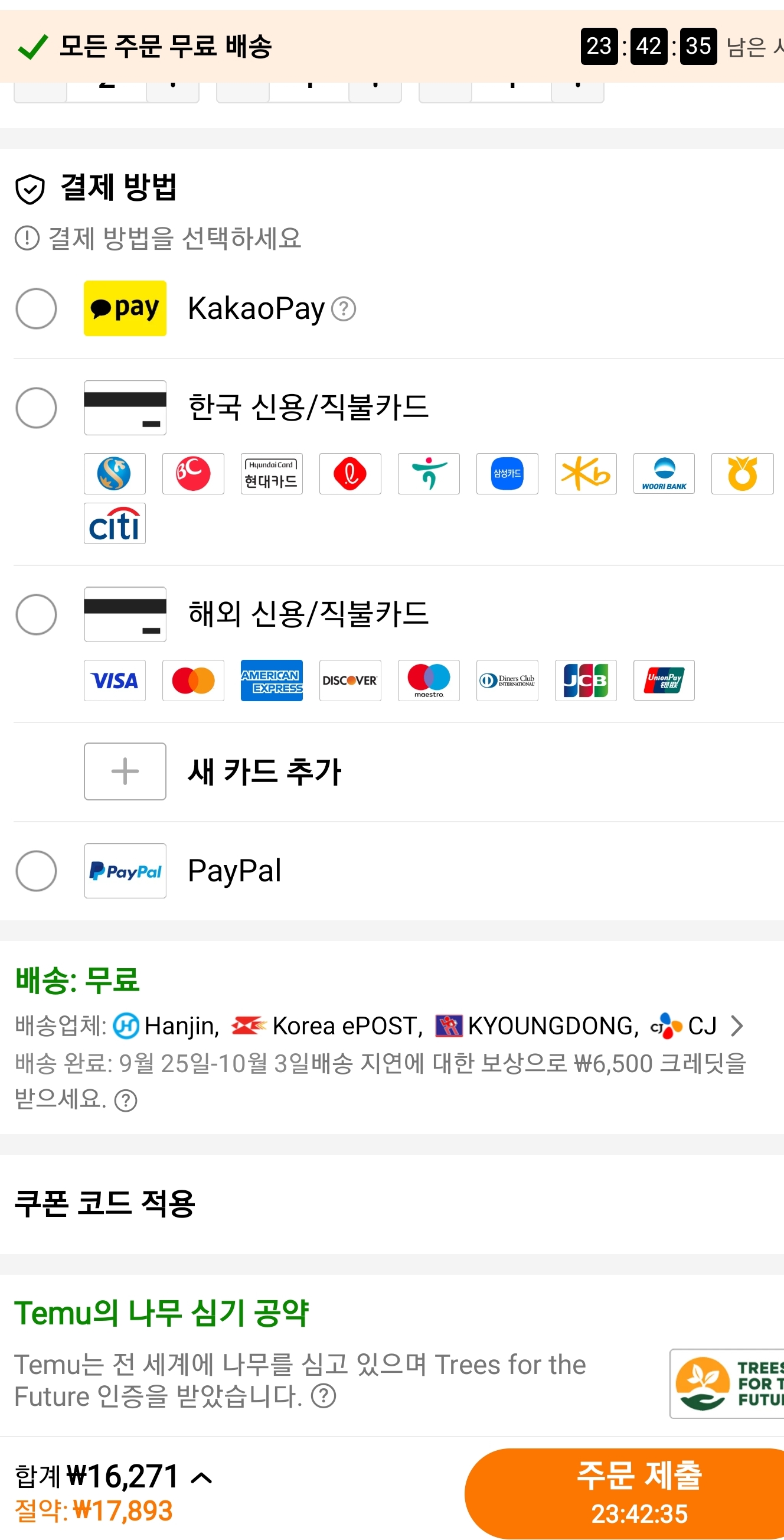 테무에서는 카카오페이, 한국 신용/직불카드, 해외 신용/직불카드, PayPal 까지 모두 이용가능합니다. 저역시도 앱카드이용하여 결제까지 아주 손쉽게 이용하였습니다. 자주 사용하시는 결제수단 입력하셔서 더욱 편리하게 결제하세요.
