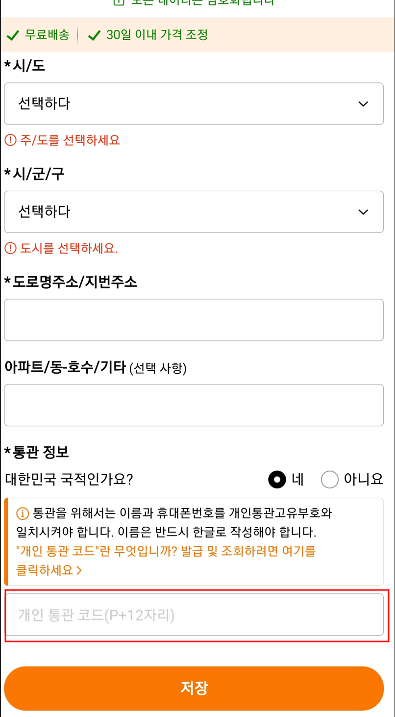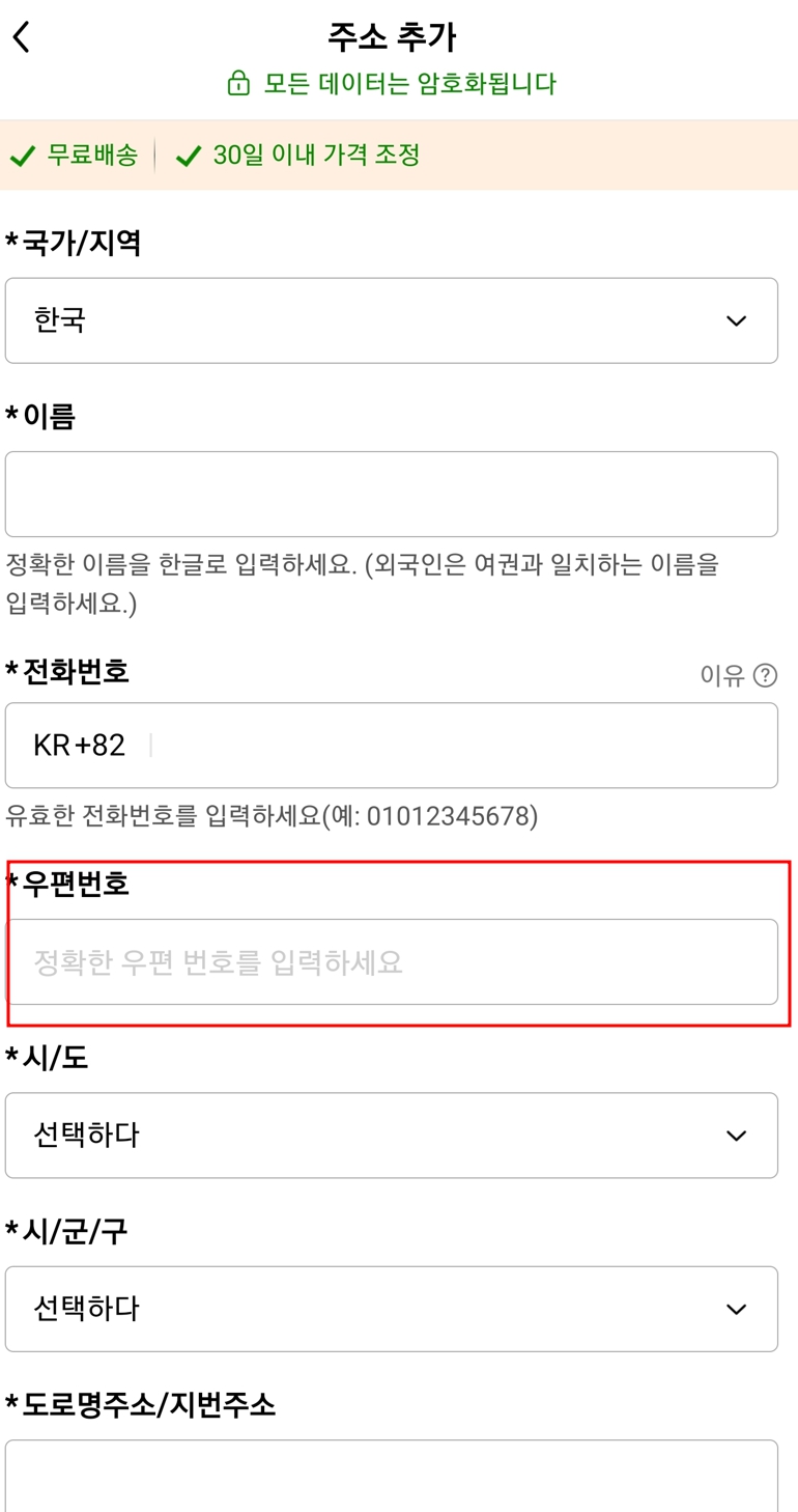 여기서 추가로 국내 쇼핑몰과 달리 준비하셔야할 사항이 2가지가 있습니다. 바로 우편번호와 개인통관번호 입력입니다. 우편번호는 보통 사용하지 않아 외워두시질 않는데요 아래 링크가셔서 주소입력하시면 손쉽게 확인하실수있습니다.